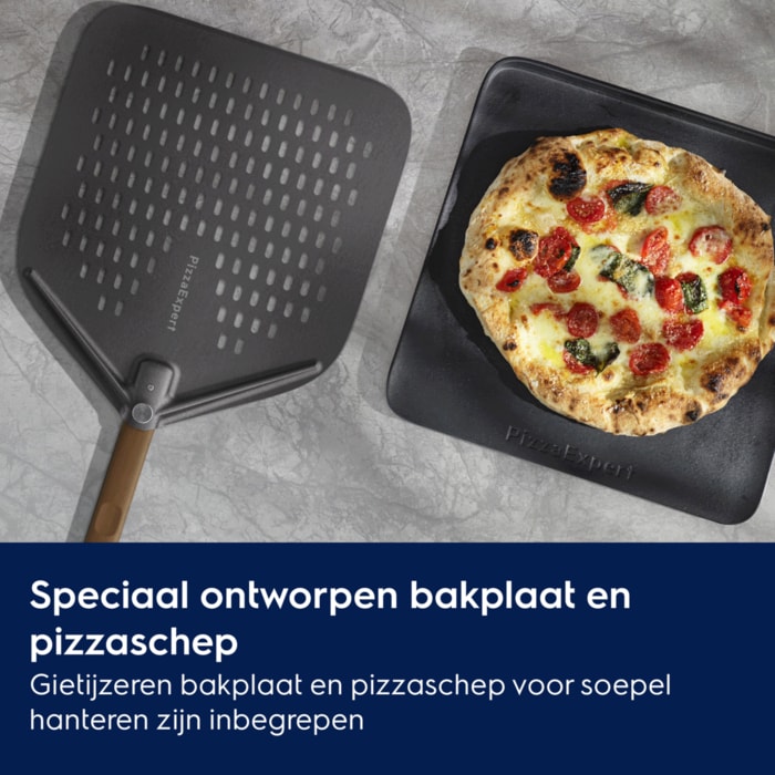 Wordt geleverd met bijbehorende pizzakit; een gietijzeren bakplaat en geperforeerde pizzaschep.