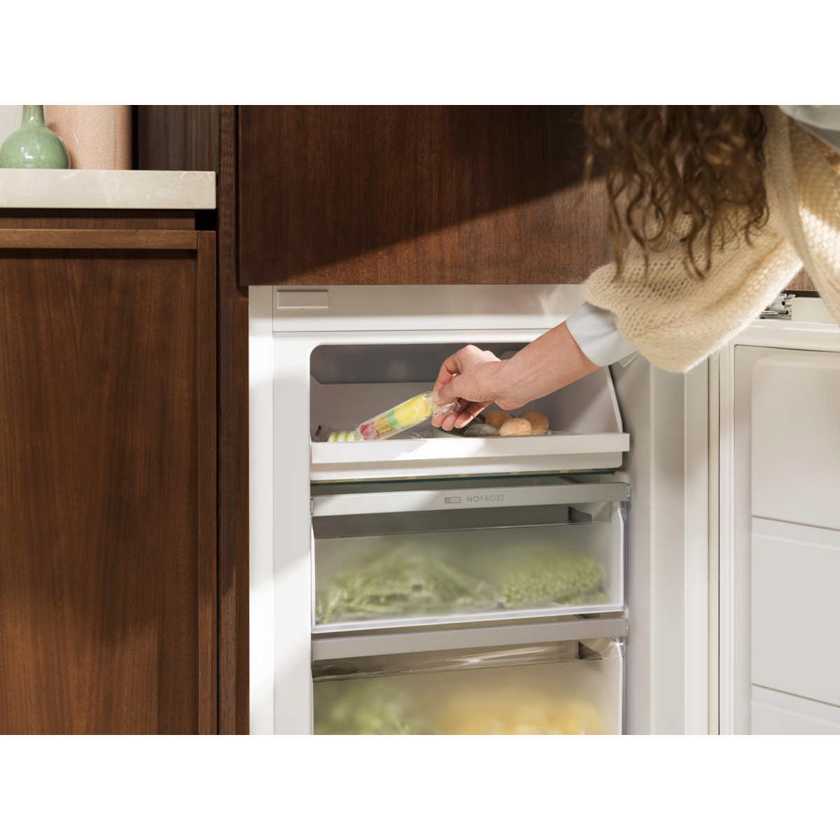De 700 NoFrost AI CoolAssist-koel-vrieskast past zich aan op jouw dagelijkse routine – of je nu boodschappen inruimt of op vakantie gaat. Dankzij NoFrost ontstaat er geen ijsvorming, zodat je nooit hoeft te ontdooien.